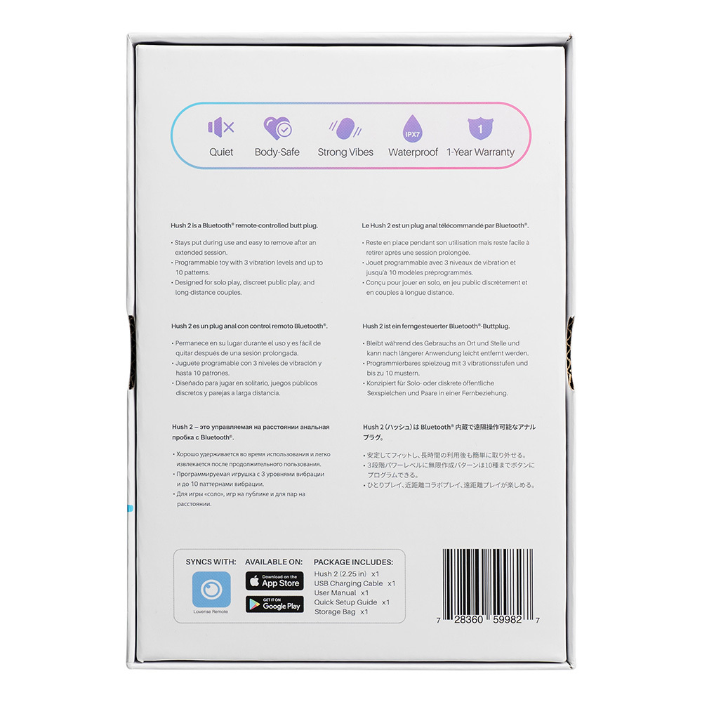 - Синхронизация с онлайн-контентом - Hush 2 для мощных анальных вибраций, Gush 2 для удовольствия ствола - обе функции синхронизированы с вашими любимыми видео или играми.