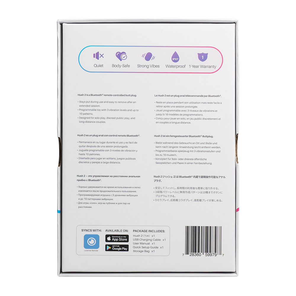 - Синхронизация с онлайн-контентом - Hush 2 для мощных анальных вибраций, Gush 2 для удовольствия ствола - обе функции синхронизированы с вашими любимыми видео или играми.