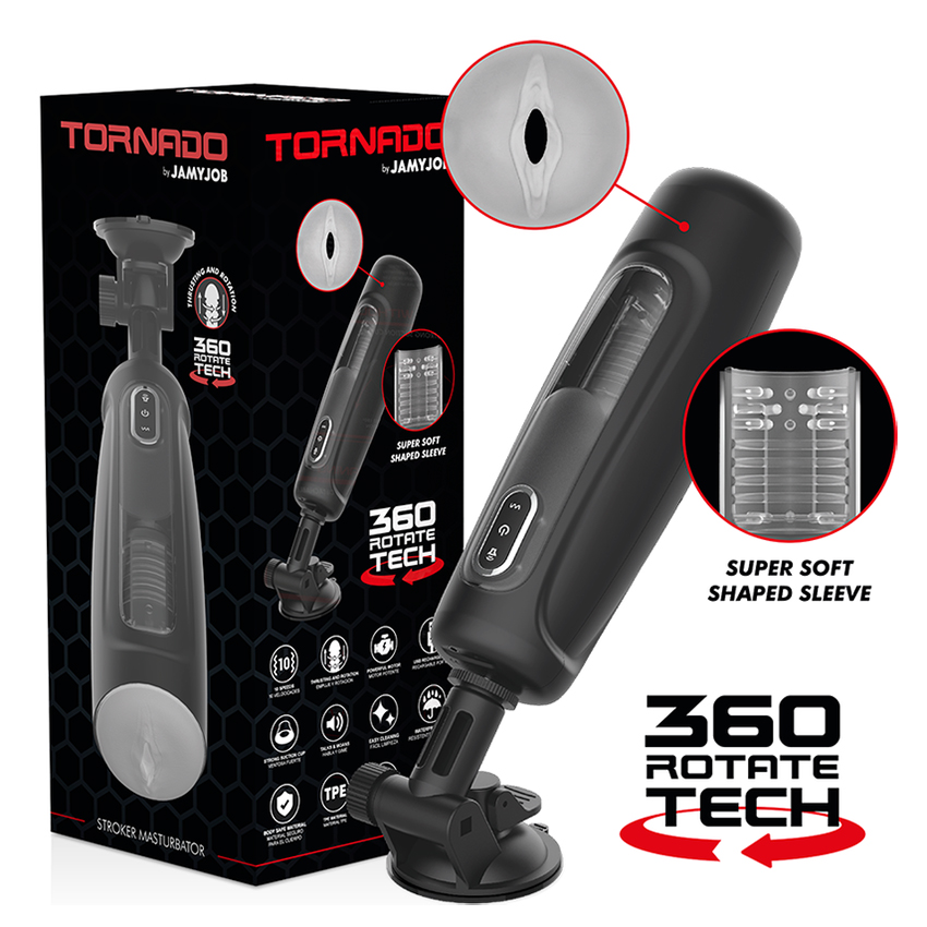 Торнадо - одно из самых поразительных явлений природы: столбы воздуха, стремительно вращающиеся вокруг своей оси и сметающие всё вокруг. Автоматический мастурбатор JamyJob Tornado 360 Rotate Tech Masturbator также "смертельно опасен и шокирующ"! Это 5-й уровень, и вы убедитесь в этом, как только снимете его с мягкой поверхности.