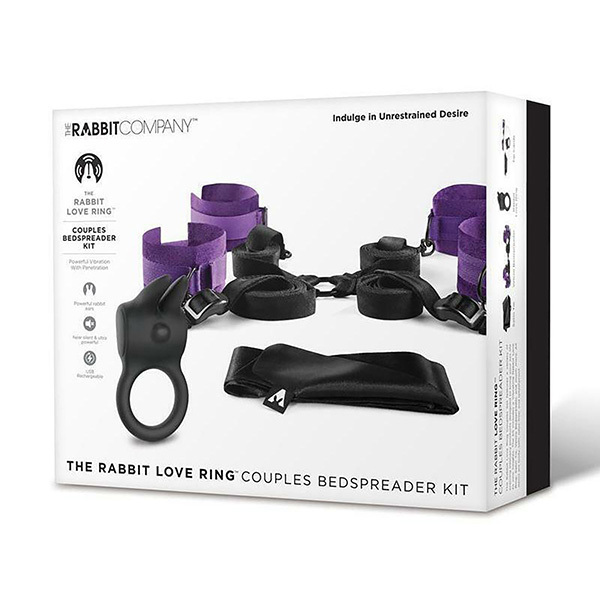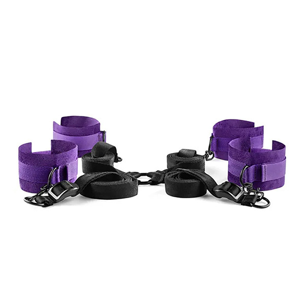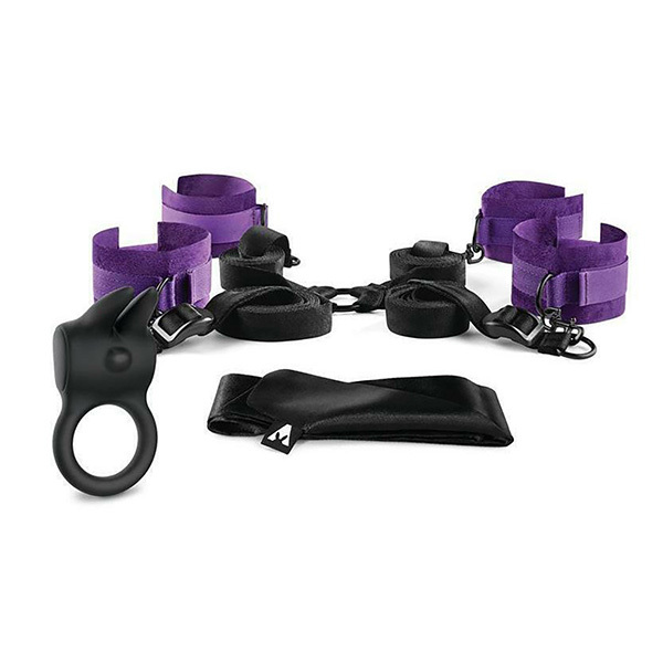 Идеальный набор для любовников из 4 мягких фиолетовых оков со стропами для крепления под матрас, атласная лента для связывания и перезаряжаемое вибро-кольцо в виде зайчика с ушками.