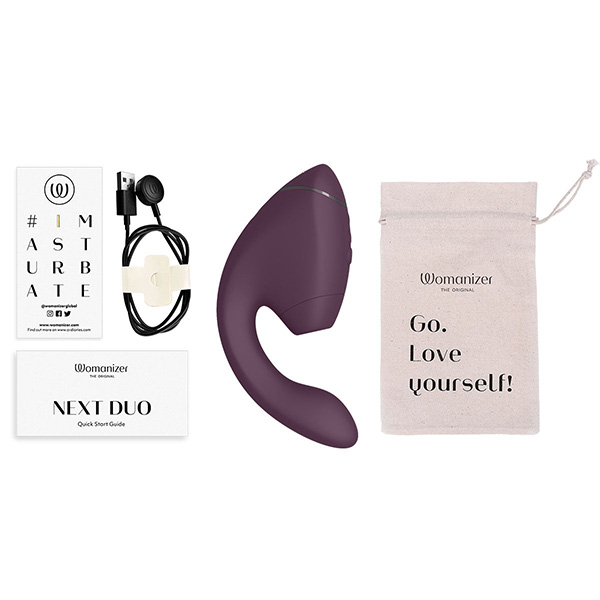 Двойной стимулятор в темно-фиолетовом цвете Womanizer Next Duo Dark Purple WZ142SGD разработанный для того, чтобы поднять интимные ощущения на новый уровень, т.к. сочетает в себе две инновационные технологии: фирменную технологию 3D Pleasure Air и мощные, глубокие вибрации для точки G.
