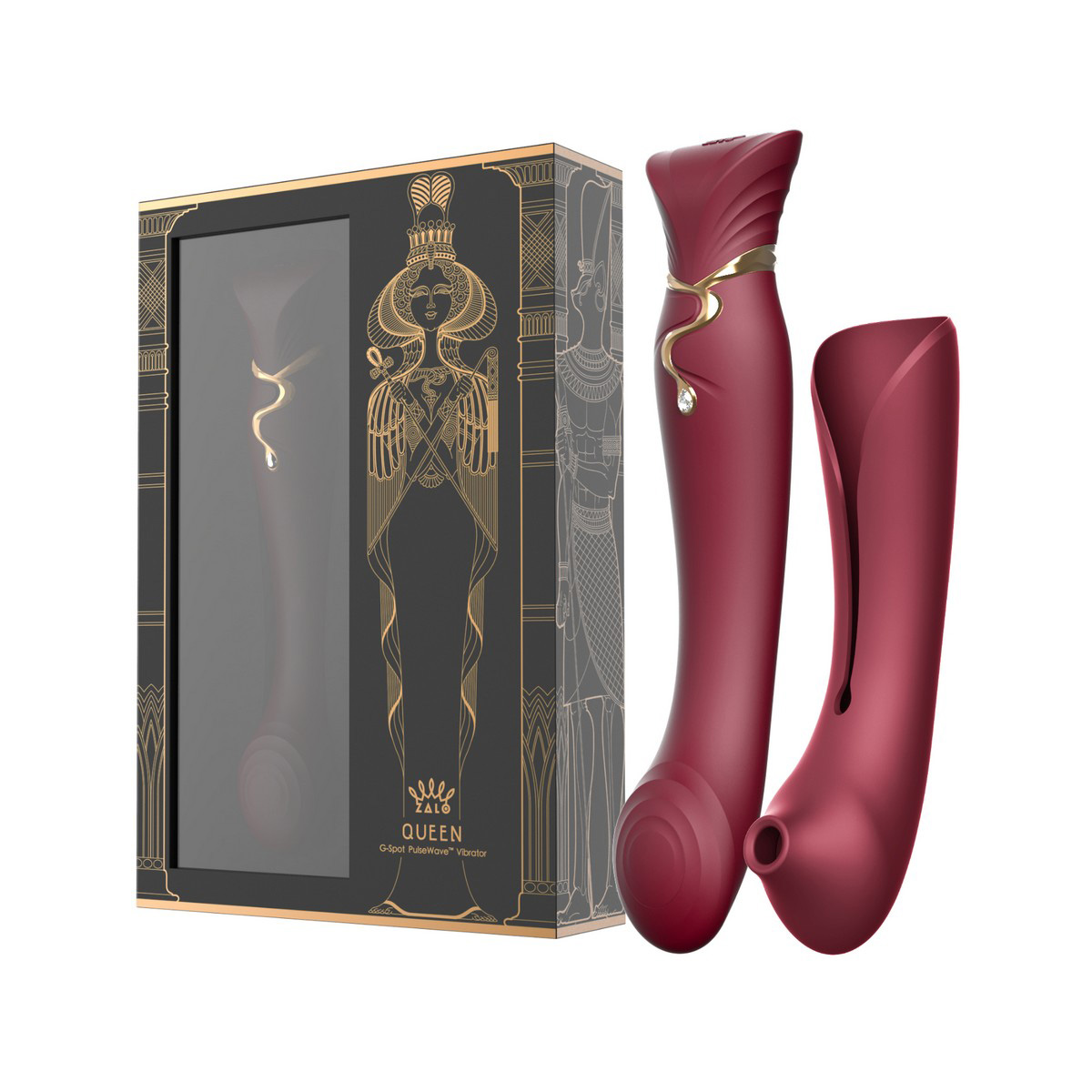 Ощутите истинную роскошь с вибратором Zalo Queen G-spot PulseWave Vibrator with Suction Sleeve Wine Red, созданным для того, чтобы вы почувствовали себя королевой. Этот не просто инструмент удовольствия, а произведение искусства, вдохновлённое Клеопатрой, женщиной, которая знала цену страсти и властвовала над желаниями. Изящный, соблазнительный силуэт "Королевы" с золотыми деталями и настоящими кристаллами Swarovski излучает силу и роскошь.